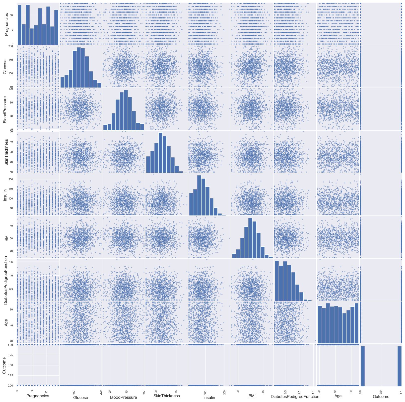 scatter_matrix(diabetes_data, figsize=(20, 20))