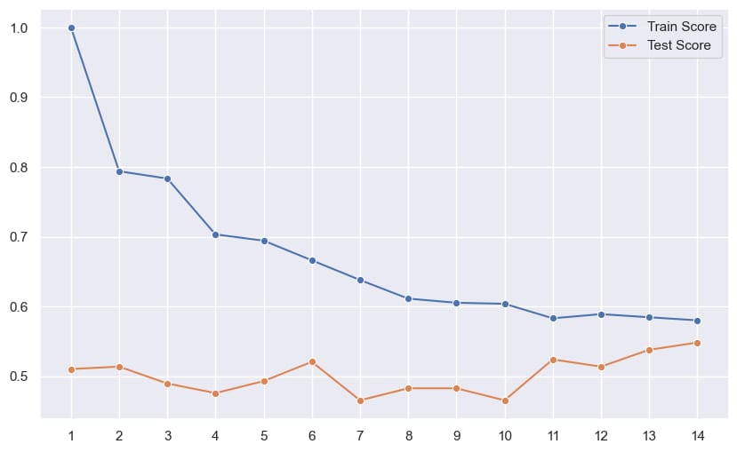 X_train, X_test, y_train, y_test = train_test_split(X, y, test_size=0.3, random_state=42, stratify=y)from sklearn.neighbors import KNeighborsClassifiertest_scores = []